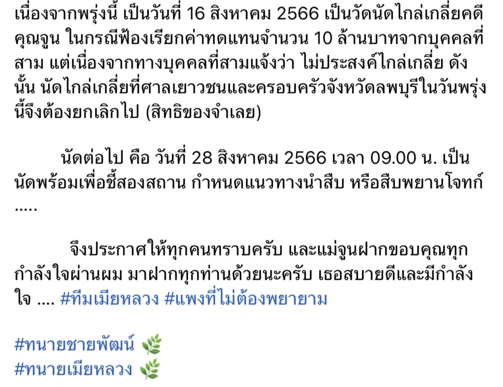 นัดต่อไปคือ วันที่ 28 ส.ค.2566 เวลา 09.00 น. เป็นนัดพร้อมเพื่อชี้สองสถาน กำหนดแนวทางนำสืบ หรือสืบพยานโจทก์ จึงประกาศให้ทุกคนทราบครับ และแม่จูนฝากขอบคุณทุกกำลังใจผ่านผม มาฝากทุกท่านด้วยนะครับ เธอสบายดีและมีกำลังใจ …. #ทีมเมียหลวง #แพงที่ไม่ต้องพยายาม