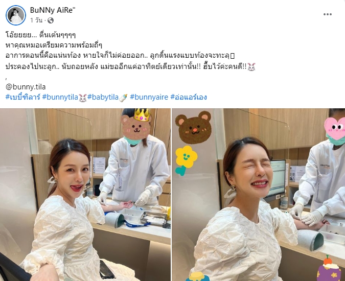 ล่าสุด สาวแอร์ ได้โพสต์ภาพขณะไปพบคุณหมอ เพื่อตรวจร่างกายเตรียมความพร้อมต่าง ๆ โดยระบุแคปชั่นผ่านอินสคราแกรมส่วนตัวว่า “โอ๊ยยยย… ตื่นเต้นๆๆๆๆ หาคุณหมอเตรียมความพร้อมถี่ๆ อาการตอนนี้คือแน่นท้อง หายใจก็ไม่ค่อยออก.. ลูกดิ้นแรงแบบท้องจะทะลุ ประคองไปนะลูก.. นับถอยหลัง แม่ขออีกแค่อาทิตย์เดียวเท่านั้น!! ฮึ๊บไว้ค่ะคนดี!! @bunny.tila #เบบี๋ฑิลาร์ #bunnytila #babytila #bunnyaire #อ่อแอร์เอง”