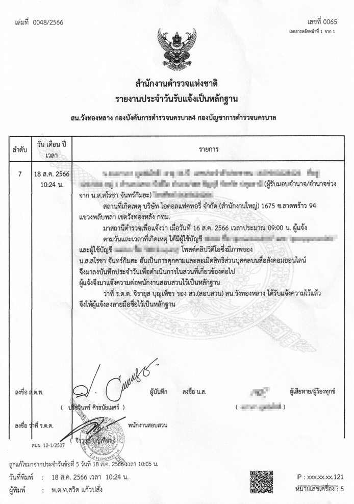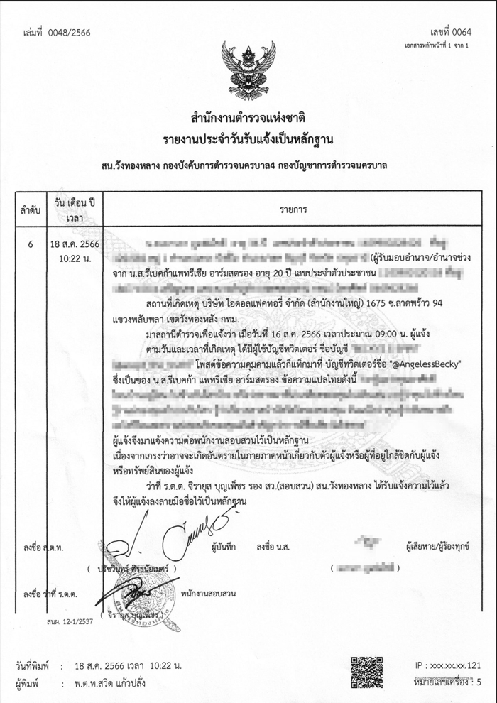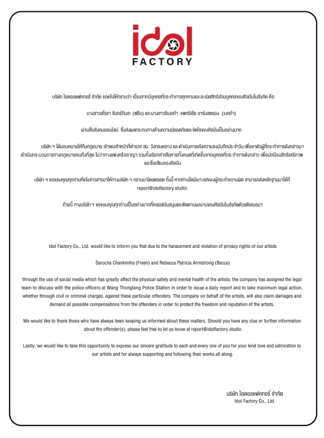“ทางบริษัทได้รับมอบหมายจากทางศิลปินในสังกัด เมื่อวันที่ 17 สิงหาคม 2566 เพื่อให้ทางฝ่ายกฎหมายเข้าพบเจ้าหน้าที่ตำรวจ สน. วังทองหลาง และได้ดำเนินการแจ้งความลงบันทึกประจำ เพื่อดำเนินการกับบุคคลที่กระทำการคุกคามและละเมิดสิทธิ์ส่วนบุคคลของศิลปินในสังกัด”
