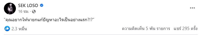 ล่าสุด เสก โลโซ นักร้องชื่อดังได้ออกมาโพสต์ผ่านเฟซบุ๊กส่วนตัว ถามประชาชนว่า “คุณอยากให้นายกแก้ปัญหาอะไรเป็นอย่างแรก?!?”