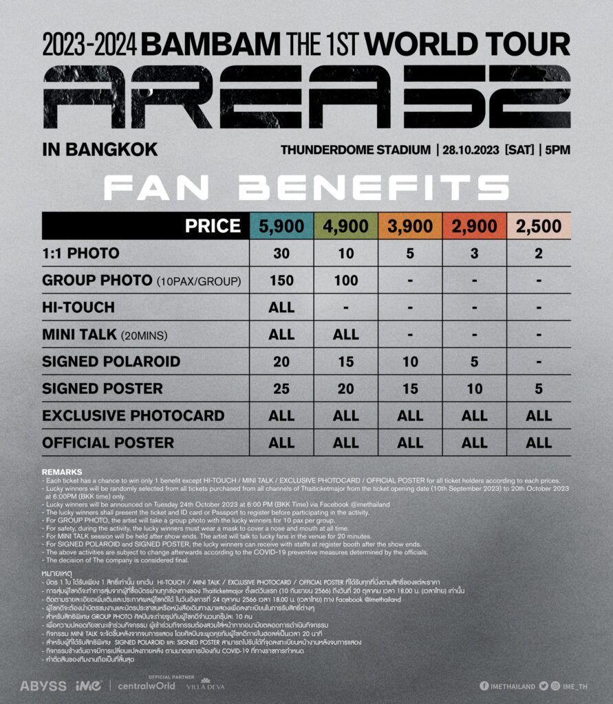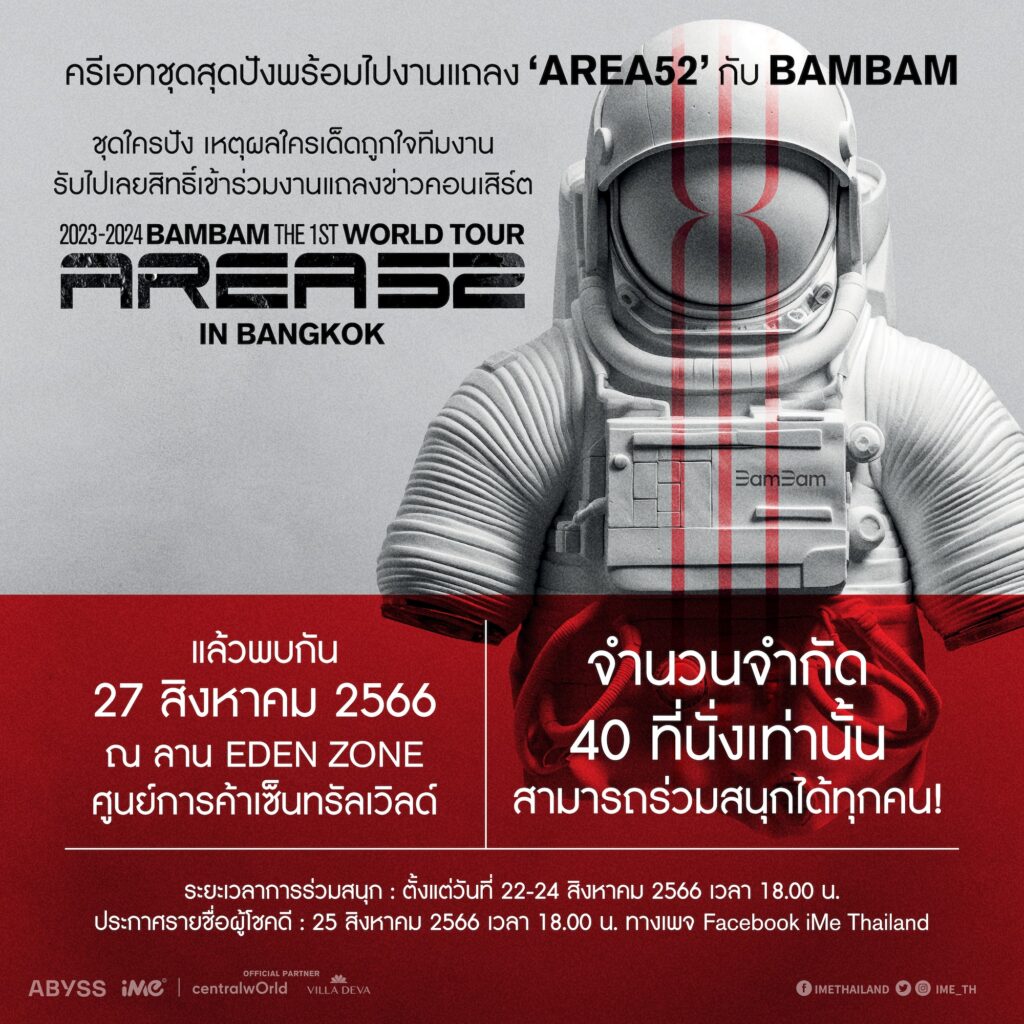 แถมงานนี้ทางผู้จัดงานอย่าง ไอมี่ไทยแลนด์ (iMe Thailand) ผู้จัดงานมืออาชีพ เตรียมจัดเต็ม จัดใหญ่ให้เหล่าอากาเซ่ (IGOT7) ไทย ได้พบกับ “แบมแบม” อย่างใกล้ชิดโดยเปิดโอกาสให้เหล่าแฟนคลับได้เตรียมอุ่นเครื่องแบบยิ่งใหญ่สมเกียรติดินแดนเมียหลวงด้วยการชวนกันมาออกแบบชุดสุดปังในธีม AREA 52 สำหรับงานแถลงข่าวในครั้งนี้ อากาเซ่คนไหนออกแบบชุด และให้เหตุผลได้ถูกใจทีมงานที่สุด 40 คนจะได้รับสิทธิ์เข้าร่วมงานแถลงข่าวไปเลย 1 ที่นั่ง บอกเลยว่างานนี้ห้ามพลาด!! ทั้งผู้จัด และศิลปินเตรียมความพิเศษรอโชว์ให้ทั้งสื่อมวลชน และแฟนๆ ได้เซอร์ไพรส์กันอย่างแน่นอน