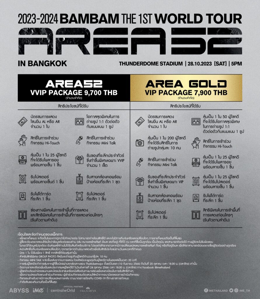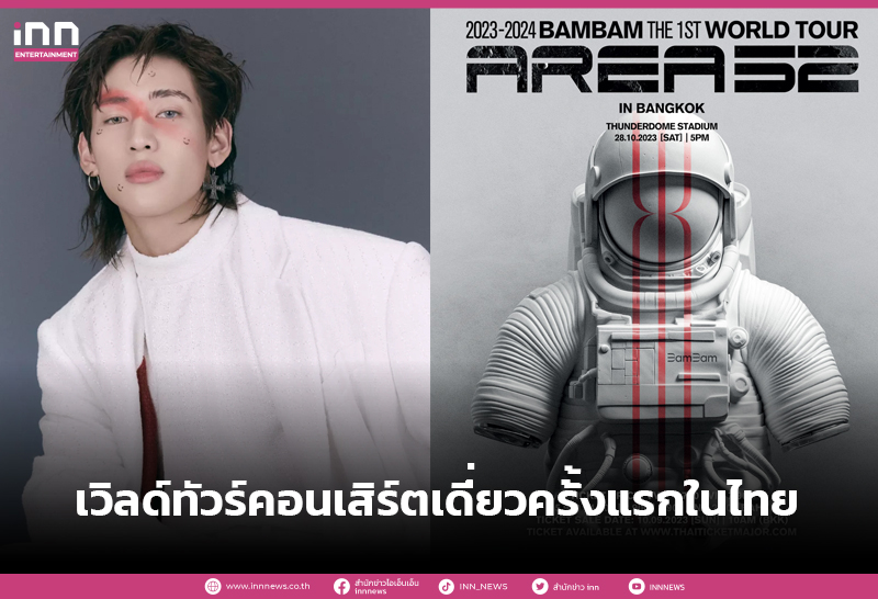 เหล่าอากาเซ่ไทยเตรียมนับถอยหลังกันได้เลย หลังศิลปินหนุ่มสุดออต แบมแบม กันต์พิมุกต์ ภูวกุล สมาชิกแห่งบอยแบนด์วง “ก็อตเซเว่น” (GOT7) จากเกาหลีใต้ เตรียมมาเวิลด์ทัวร์คอนเสิร์ตเดี่ยวครั้งแรกในไทยกับงาน 2023-2024 BamBam THE 1ST WORLD TOUR [AREA 52] in BANGKOK ในวันเสาร์ที่ 28 ตุลาคมนี้ ณ ธันเดอร์โดม สเตเดียม (Thunderdome Stadium) เวลา 17.00 น.