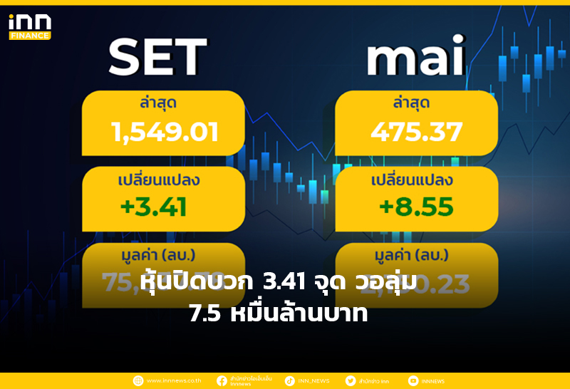 หุ้นปิดบวก 3.41 จุด วอลุ่ม 7.5 หมื่นล้านบาท