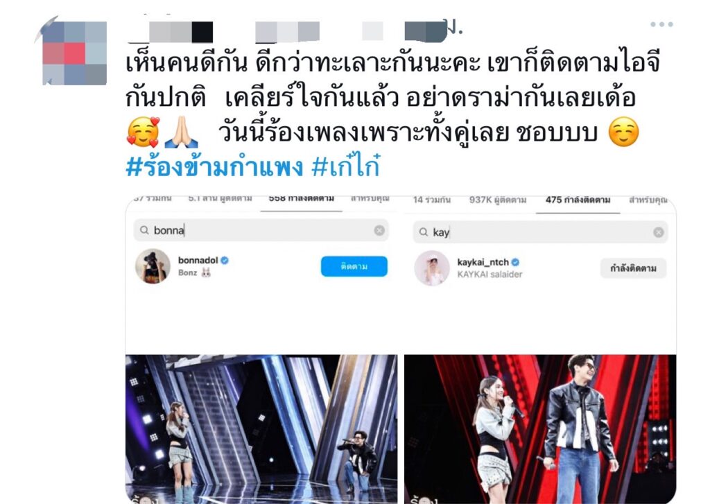 แต่ก็มีชาวเน็ตบางกลุ่มเข้ามาปกป้องว่าเขาเคลียร์ใจกันแล้ว , เห็นคนดีกัน ดีกว่าทะเลาะกันนะคะ เขาก็ติดตามไอจีกันปกติ, นอกจากนี้ยังเอ่ยปากชมว่าทั้งคู่ร้องเพลงเพราะแถมยังร้องเข้าคู่กันได้ดีที่สำคัญเพิ่งเจอกันครั้งแรกแต่การหยอกล้อเล่นกันเหมือนเคยเจอกันมานาน