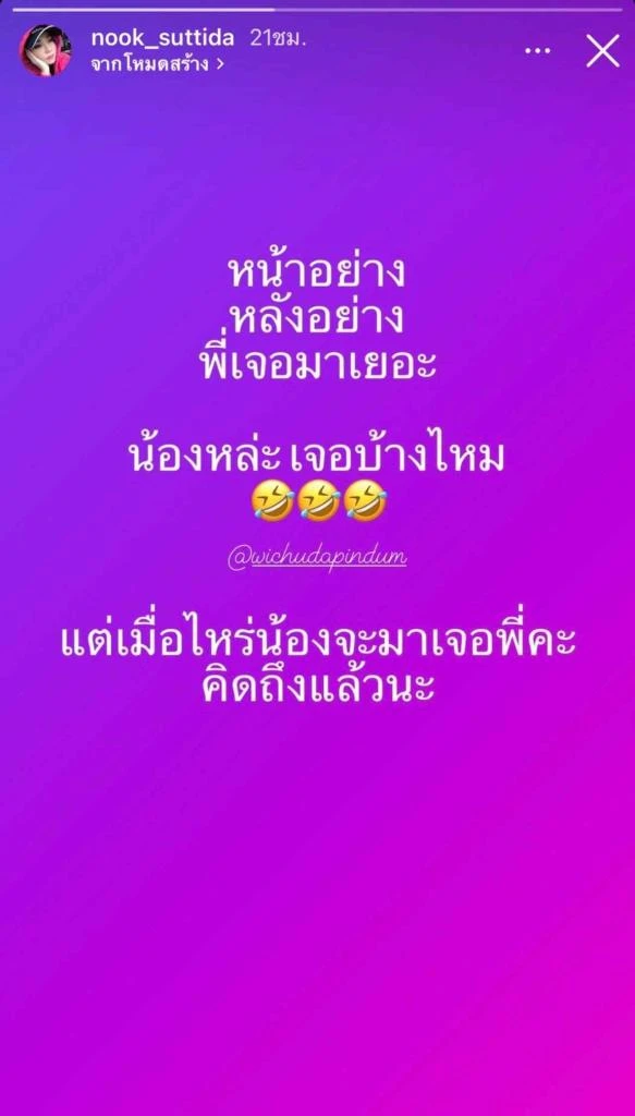 โดย “นุ๊ก สุทธิดา” ได้โพสต์ข้อความผ่านทางไอจีสตอรี่ของตัวเองว่า “หน้าอย่าง หลังอย่าง พี่เจอมาเยอะ น้องหล่ะ เจอบ้างไหม @wichudapindum แต่เมื่อไรน้องจะมาเจอพี่คะ คิดถึงแล้วนะ”