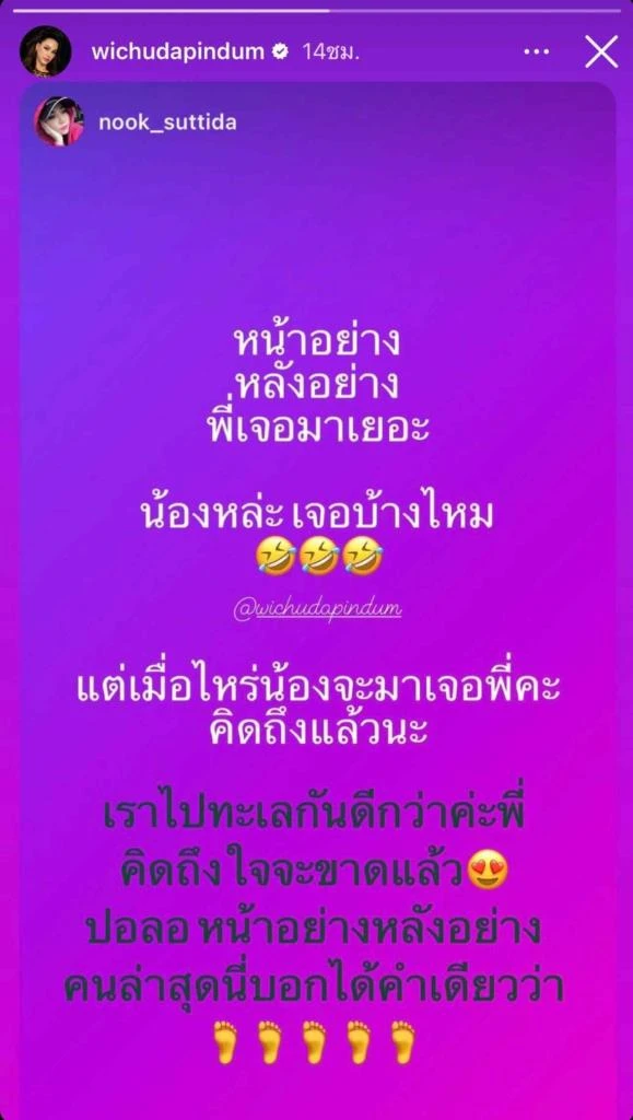 ซึ่งต่อไม่นาน แหม่ม วิชุดา ก็ได้รีโพสต์ข้อความของนุ๊กลงในไอจีสตอรี่ของตัวเอง พร้อมระบุข้อความว่า “เราไปทะเลกันดีกว่าค่ะพี่ คิดถึงใจจะขาดแล้ว ปอลอ หน้าอย่างหลังอย่าง คนล่าสุดนี่บอกได้คำเดียวว่า” พร้อมกับใส่อีโมจิรูปเท้า