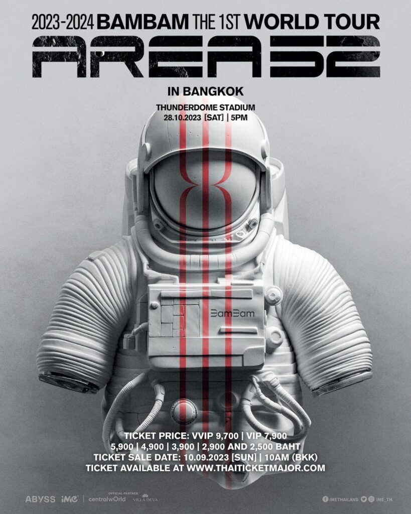 ปิดจ็อปกันที่ศิลปินหนุ่มสุดออต “แบมแบม กันต์พิมุกต์ภูวกุล” สมาชิกแห่งบอยแบนด์วง “ก็อตเซเว่น” (GOT7) จากเกาหลีใต้ เตรียมมาเวิลด์ทัวร์คอนเสิร์ตเดี่ยวครั้งแรกในไทยกับงาน 2023-2024 BamBam THE 1ST WORLD TOUR [AREA 52] in BANGKOK ในวันเสาร์ที่ 28 ตุลาคมนี้ ณ ธันเดอร์โดม สเตเดียม (Thunderdome Stadium) เวลา 17.00 น. โดย แบมแบม จะบินลัดฟ้ามาร่วมงานแถลงข่าวเวิลด์ทัวร์คอนเสิร์ตเดี่ยวครั้งแรกในไทยครั้งนี้ด้วยตัวเอง ในวันอาทิตย์ที่ 27 สิงหาคมนี้