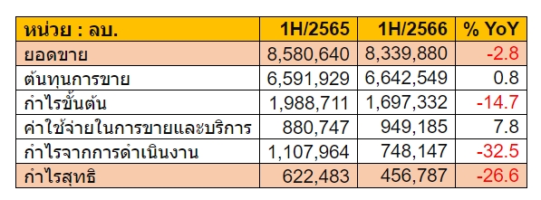 ด้านผลการดำเนินงานของ บจ. ในตลาดหลักทรัพย์ เอ็ม เอ ไอ (mai) งวดครึ่งแรกปี 2566 เทียบกับช่วงเดียวกันของปีก่อน มียอดขายรวม 95,183 ล้านบาท เพิ่มขึ้น 1.3% ต้นทุนการผลิต 71,014 ล้านบาท ลดลง 0.3% ค่าใช้จ่ายในการขายและบริหาร 18,619 ล้านบาท เพิ่มขึ้น 15.0% ส่งผลให้กำไรจากการดำเนินงานอยู่ที่ 5,550 ล้านบาท ลดลง 14.1% และกำไรสุทธิ 1,503 ล้านบาท ลดลง 71.0%
