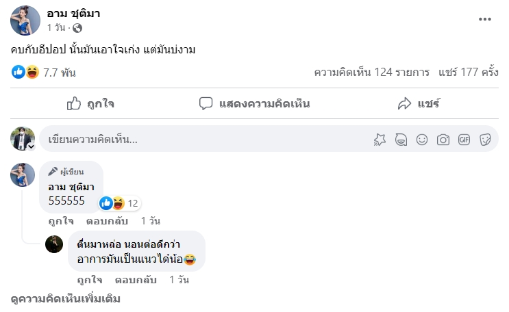 ล่าสุด “อาม ชุติมา” ออกมาประกาศโสดผ่านเฟซบุ๊กส่วนตัวระบุข้อความว่า “สวัสดีค่ะ โสดอย่างเป็นทางการ” ก่อนจะโพสต์อีกว่า “คบกับอีปอป นั้นมันเอาใจเก่ง แต่มันบ่งาม”