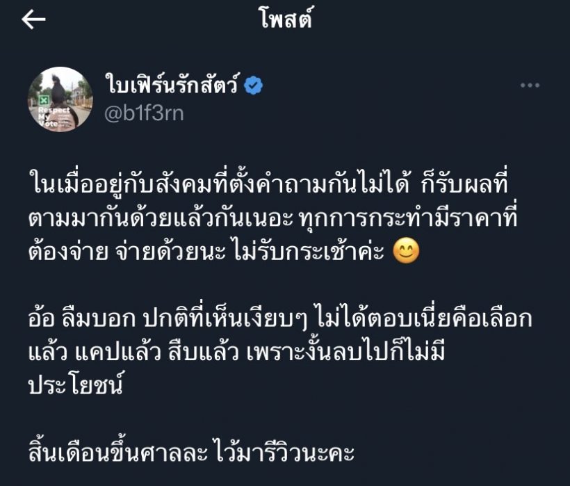 “อ้อ ลืมบอก ปกติที่เห็นเงียบๆ ไม่ได้ตอบเนี่ยคือเลือกแล้ว แคปแล้ว สืบแล้ว เพราะงั้นลบไปก็ไม่มีประโยชน์ สิ้นเดือนขึ้นศาลละ ไว้มารีวิวนะคะ“ท่ามกลางคอมเมนต์เข้ามาแสดงความคิดเห็นให้ดาราสาวจัดการให้ถึงที่สุด