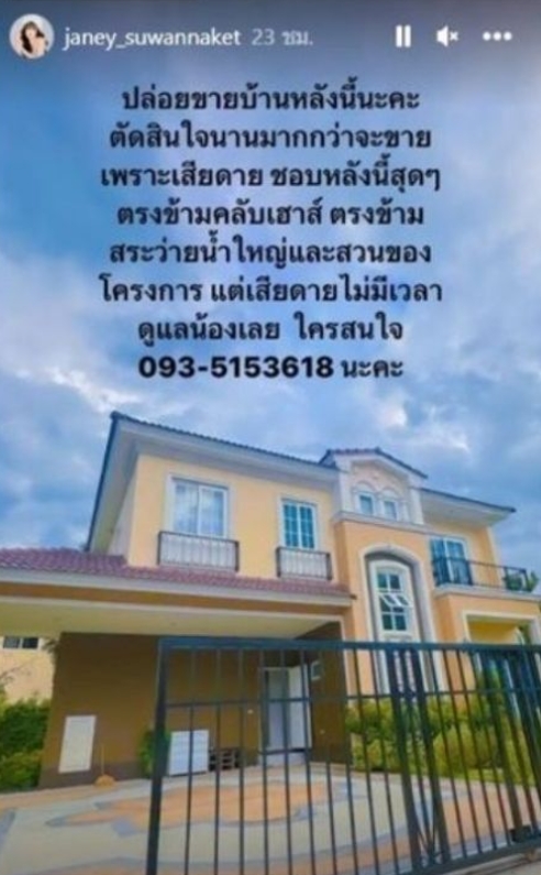 แต่ล่าสุด “เจนนี่” ได้ออกมาประกาศขายบ้านดังกล่าวแล้ว โดยบอกเหตุผลว่าไม่มีเวลาดูแล ซึ่งเจ้าตัวได้โพสต์ข้อความลงในไอจีสตอรี่ว่า… “ปล่อยขายบ้านหลังนี้นะคะ ตัดสินใจนานมากกว่าจะขาย เพราะเสียดาย ชอบหลังนี้สุดๆ ตรงข้ามคลับเฮาส์ ตรงข้ามสระว่ายน้ำใหญ่ และสวนของโครงการ แต่เสียดายไม่มีเวลาดูแลน้องเลย ใครสนใจ โทร…. นะคะ”