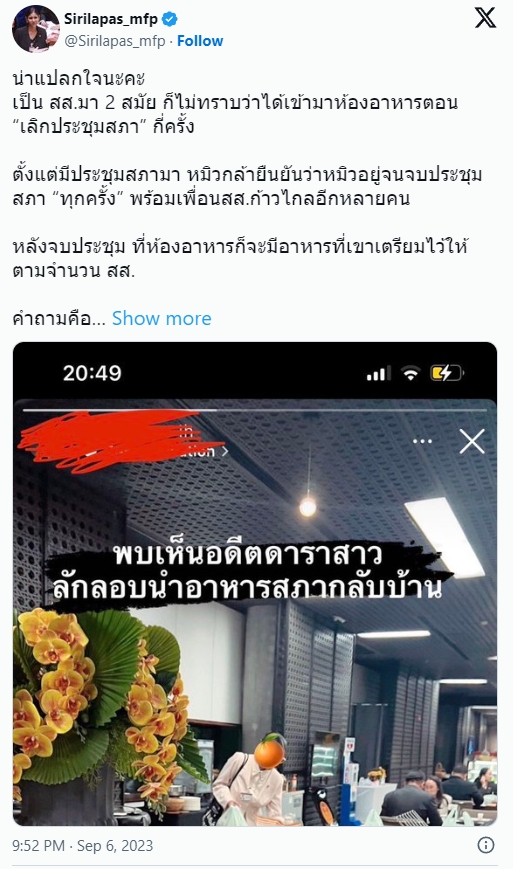 เรียกว่าเป็นประเด็นร้อนที่หลายคนกำลังให้ความในใจ จากกรณีที่ สส. ท่ามหนึ่ง ได้แอบถ่ายภาพของ สส.หมิว สิริลภัส เขตบางกะปิ จากพรรคก้าวไกล ที่เป็นภาพของ สส.หมิวกำลังหยิบอาหารจากห้องอาหารไป และลงข้อความประจานว่า “พบเห็นอดีตดาราสาว ลักลอบนำอาหารสภากลับบ้าน”