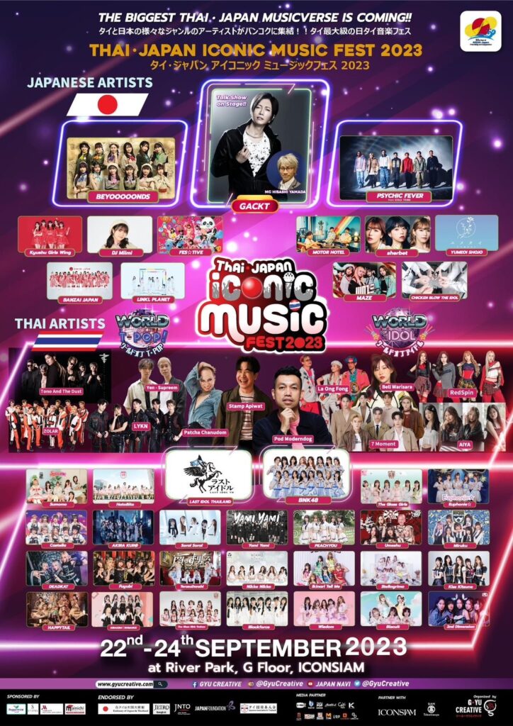 ด้าน คุณยุพเรศ เอกธุระประคัลภ์ ประธานบริหาร บริษัท จี-ยู ครีเอทีฟ จำกัดกล่าวว่า งาน Thai–Japan Iconic Music Fest 2023ในปีนี้ได้จัดขึ้นอย่างยิ่งใหญ่ แบ่งออกเป็น 2 เวทีใหญ่คือRiver Stage (Main Stage)ซึ่งจะเป็นเวทีใหญ่ริมแม่น้ำเจ้าพระยา ณ ริเวอร์ พาร์คและเวที SkyStageจัดที่ ICONSIAM PARK 1 ชั้น 2 และยังมีกิจกรรมต่างๆมากมาย ที่เจริญนคร ฮอลล์ ชั้น M และรัษฎา ฮอลล์ ชั้น 1ซึ่งในงานนี้ถือเป็นการรวมตัวของเหล่าศิลปินญี่ปุ่นที่ยิ่งใหญ่ที่สุดในประเทศไทยอีกครั้ง นำทัพศิลปินโดย GACKT (แก๊กต์) นักร้องเจ-ร็อกและนักแสดงชื่อดังมากความสามารถในกิจกรรมSpecial Live!! ทอล์คโชว์พร้อมกับพิธีกรดีเจชาวญี่ปุ่นชื่อดัง Hisashi Yamada (ฮิซาชิ ยามาดะ),BEYOOOOONDS (บียอนส์) กลุ่มศิลปินสาวมากความสามารถจากประเทศญี่ปุ่นจะบินตรงมาร่วมโชว์ความสนุก ความน่ารัก ความสดใส และความสามารถด้านดนตรีแบบ FULL TEAMประกอบไปด้วยสมาชิก Ichioka Reina (อิชิโอกะ เรอินะ) Shimakura Rika (ชิมาคุระ ริกะ) Nishida Shiori (นิชิดะ ชิโอริ) Eguchi Saya (เอกุจิ ซายะ) Takase Kurumi (ทาคาเสะ คุรุมิ) Maeda Kokoro (มาเอดะ โคโคโระ) Yamazaki Yuhane(ยามาซากิ ยูฮาเนะ) Okamura Minami (โอคามุระ มินามิ) KiyonoMomohime(คิโยโนะ โมโมฮิเมะ) Hirai Miyo (ฮิราอิ มิโยะ) Kobayashi Honoka(โคบายาชิ โฮโนกะ) SatoyoshiUtano(ซาโตโยชิ อุตาโนะ) และโชว์สุดพิเศษ!! จาก DJ Miimi หนึ่งในสมาชิกสุดน่ารัก
