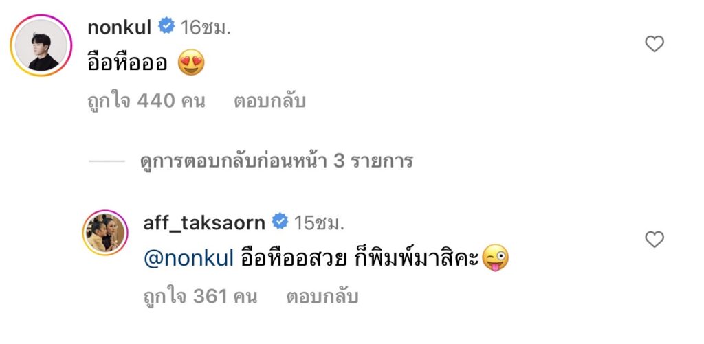 ที่ล่าสุดทำเอาชาวเน็ตจิกหมอนจนขาดเมื่อสาวแอฟ ออกมาโพสต์ภาพตัวเองในลุคสวยหรู ดูแพง ฉบับแม่แอฟ โดยงานนี้หนุ่ม นนกุล ก็อดใจไม่ไหวรีบเข้ามาคอมเมนต์แซวว่า”อือหือออ😍”ต่อมาทางด้านสาวแอฟ ก็เข้ามาตอบกลับ”อือหือ สวยก็พิมมาสิคะ🤪” ว๊ายหยอกกันแบบนี้ จะรอช้าไยก็เปิดตัวสิค่ะ