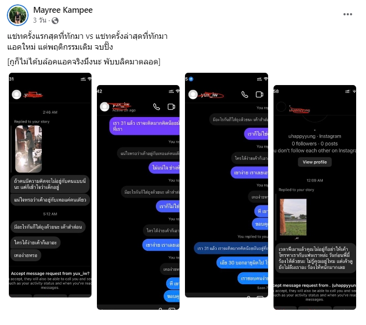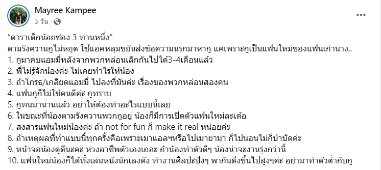นอกจากนี้เธอยังโพสต์ข้อความ จากแชทที่อีกฝ่าย เอาแอคหลุม มาตามด่า ตามรังควานเธอด้วยคำพูดรุนแรงงานอีกด้วย และดูเหมืแนว่าหากอีกฝ่ายไม่ยอมจบ ทาง เม ก็คงจะไม่ทนอีกต่อไปเช่นกัน