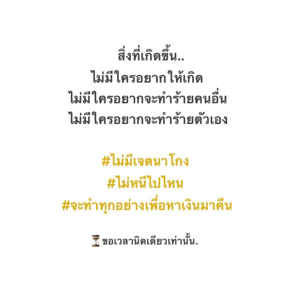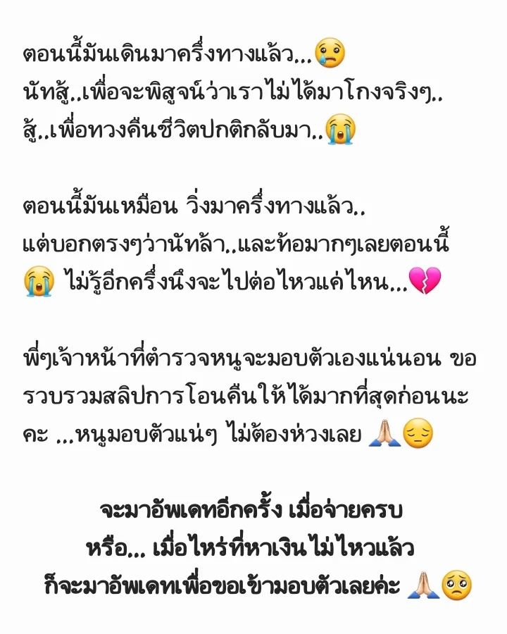 ทั้งนี้ในโพสต์ นัตตี้ ยังได้มีการแจ้งว่าทุกสลิปการโอนคืนนัทมีหลักฐาน และได้มีการกล่าวถึงการมอบตัว โดยได้ระบุไว้ว่า “พี่ ๆ เจ้าหน้าที่จำรวจหนูจะมอบตัวแน่นนอน ขอรวบรวมสลิปการโอนคืนให้ได้มากที่สุดก่อนนะคะ หนูมอบตัวแน่ ๆ ไม่ต้องห่วง”