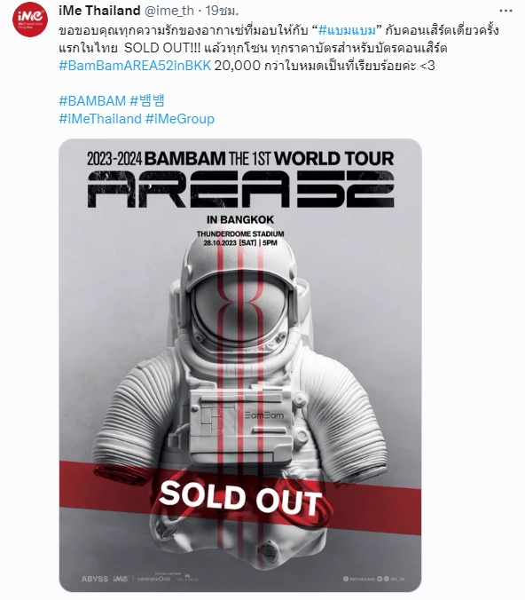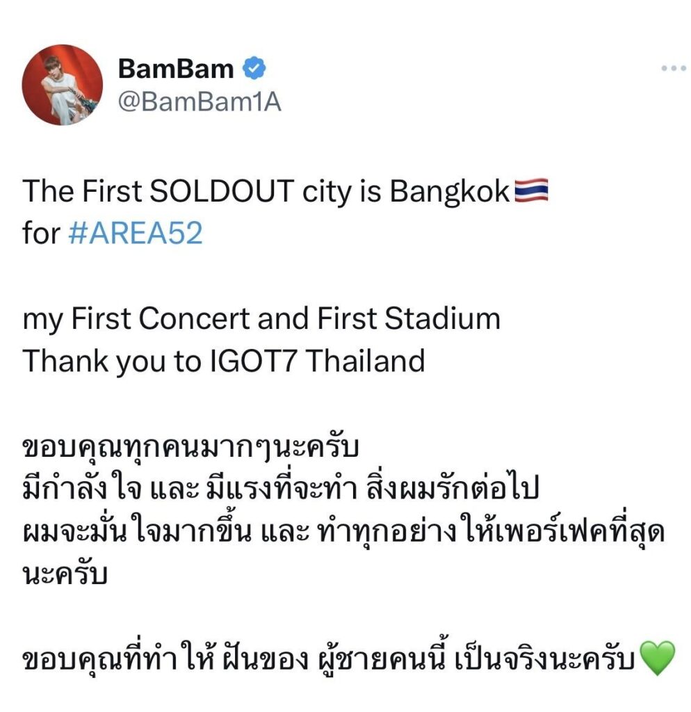 โดยหลังประกาศบัตรขายหมด “แบมแบม” ก็ได้ออกมาโพสต์ข้อความขอบคุณแฟนคลับทุกคนว่า “The First SOLDOUT city is Bangkok for #AREA52 my concert and First Stadium Thank you to IGOT7 Thailand ขอบคุณทุกคนมากๆ นะครับ มีกำลังใจและมีแรงที่จะทำสิ่งที่ผมรักต่อไป ผมจะมั่นใจมากขึ้นและทำทุกอย่างให้เพอร์เฟกต์ที่สุดนะครับ ขอบคุณที่ทำให้ฝันของผู้ชายคนนี้เป็นจริง”