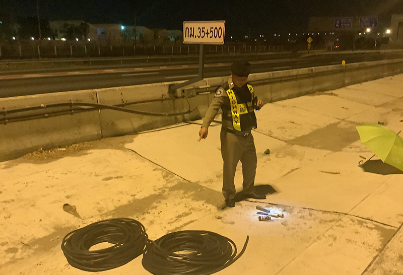 พ.ต.ต.ชยธร ถวิลเพชรสกุล สารวัตรทางหลวง 2 กล่าวว่า ตำรวจทางหลวง ได้รับแจ้งจากเจ้าหน้าที่แขวงทางหลวงพิเศษระหว่างเมืองว่ามีการลักลอบขโมยสายไฟในทางหลวงพิเศษหมายเลข 9 (ถนนกาญจนาภิเษกฝั่งตะวันออก) ทราบว่าคนร้ายใช้รถยนต์เก๋ง ยี่ห้อนิสสัน หลังทราบข้อมูลได้นำกำลังออกตรวจสอบกระทั่งพบรถต้องสงสัย จอดอยู่ที่ไหล่ทาง และพบชายเจ้าของรถพยายามวิ่งหลบหนี เจ้าหน้าที่จึงเข้าสกัดจับกุมตัวไว้ได้