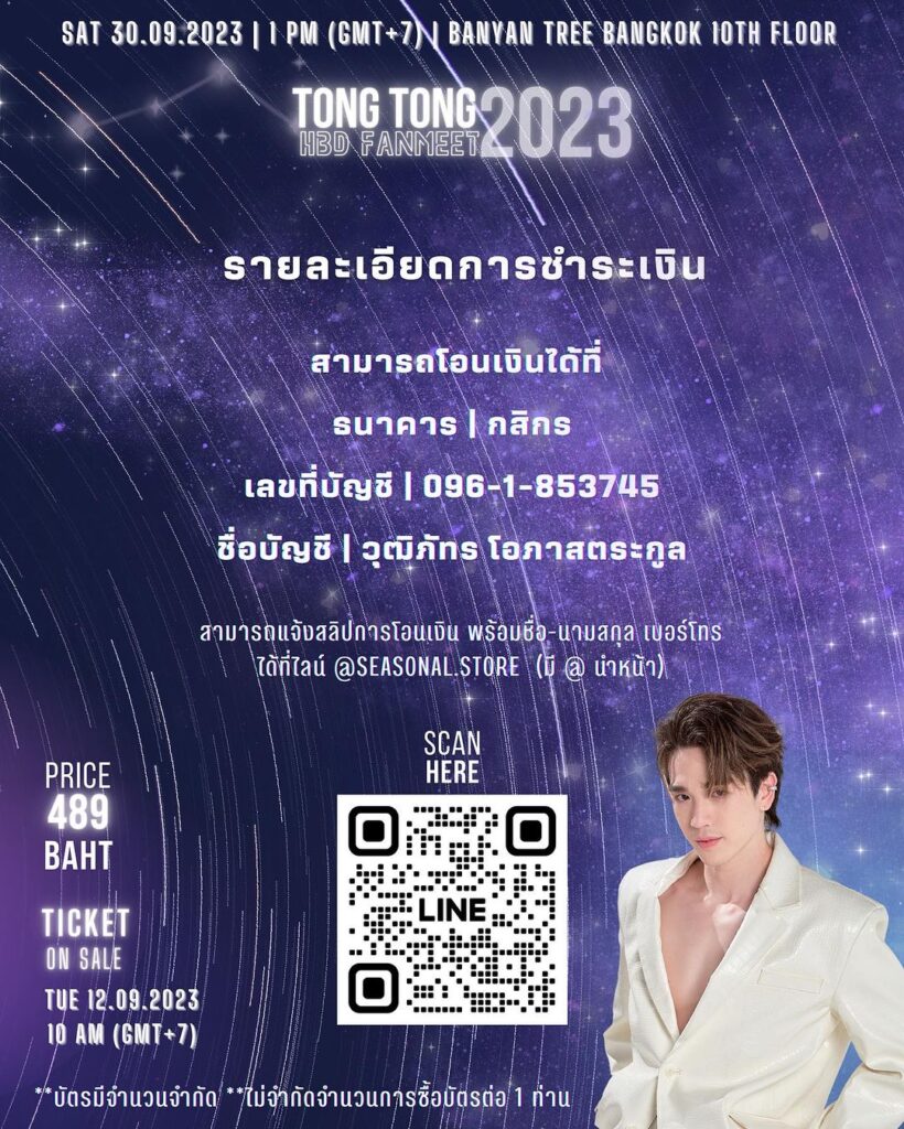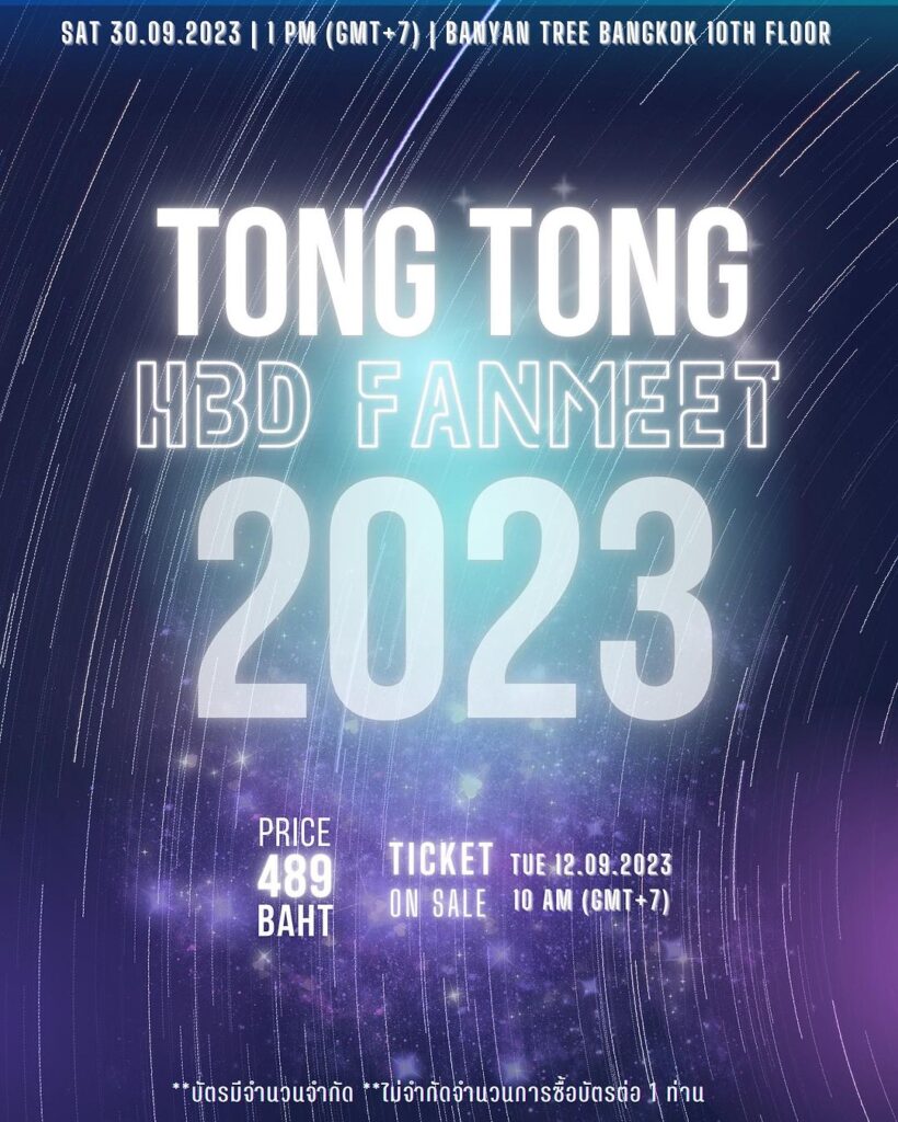 ทำเอานักแสดงหนุ่ม “ตงตง กฤษกร” ออกอาการปลื้มสุดๆ หลังประกาศจัดงานแฟนมีตวันเกิดกับงานที่ชื่อว่า “TONGTONG HBD FANMEET 2023” ที่จะเกิดขึ้นในวันเสาร์ 30 กันยายนนี้ ณ โรงแรม บันยันทรี กรุงเทพ ชั้น 10 ห้อง Banyan Ballroom ซึ่งหลังจากเปิดให้จองบัตรในราคา 489 บาท เพียงไม่กี่ชั่วโมง ปรากฎว่าบัตรแฟนมีตวันเกิดหมดเกลี้ยง ประกาศ Sold Out! เรียบร้อยแล้ว