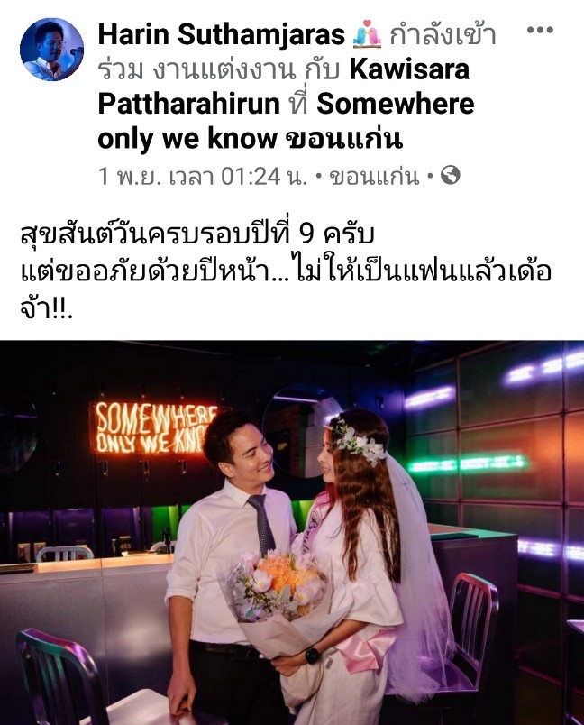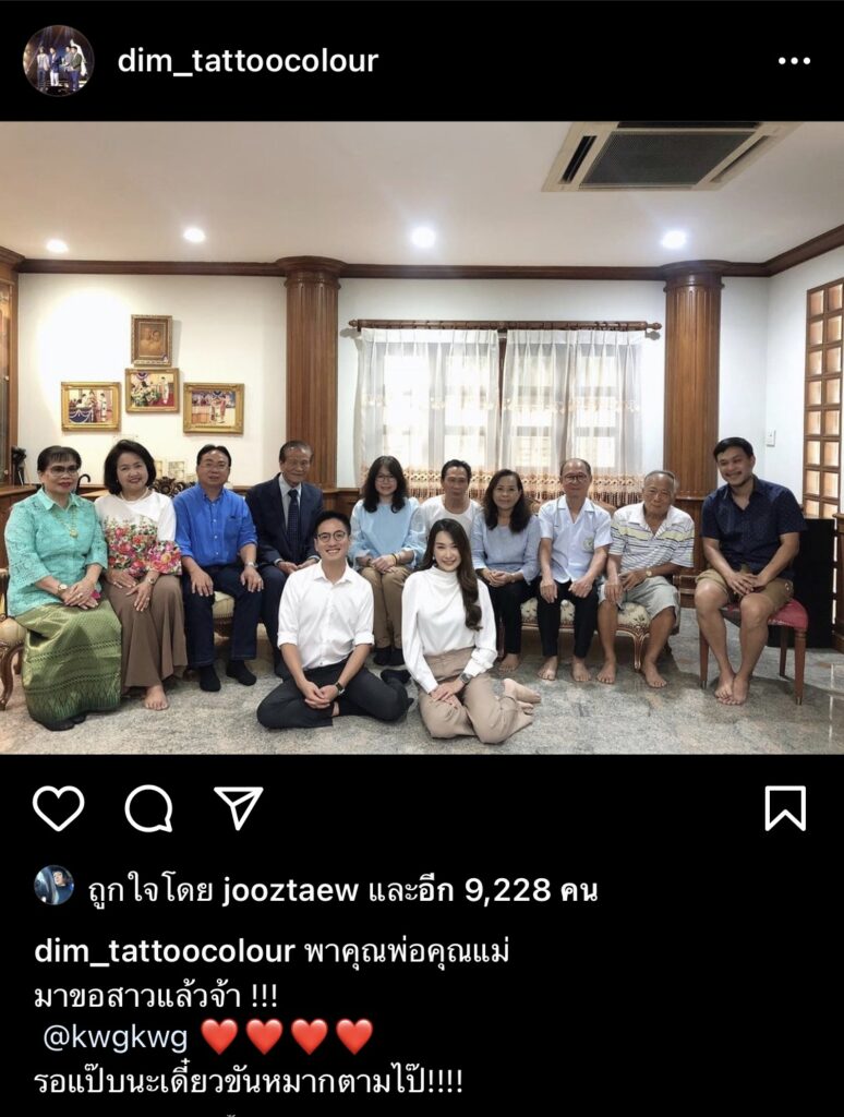 “วันนี้ผมมาขอสาวครับ !!! ปลายปีนี้ต้องรอดูกันว่า “พี่รัฐกับพี่เป๊ก” ใครจะเก่งกว่ากัน?? แล้วผมจะร้องเพลงอะไรในงานแต่งตัวเองดี ? คิดไม่ออก !!! ขอบคุณทุกท่านที่ร่วมแสดงความยินดีครับ” นอกจากนี้หนุ่มดิม ยังได้โพสต์ข่าวดีผ่านอินสตาแกรมส่วนตัวอีกว่า พาคุณพ่อคุณแม่มาขอสาวแล้วจ้า !!! @kwgkwg รอแป๊บนะเดี๋ยวขันหมากตามไป๊!!!