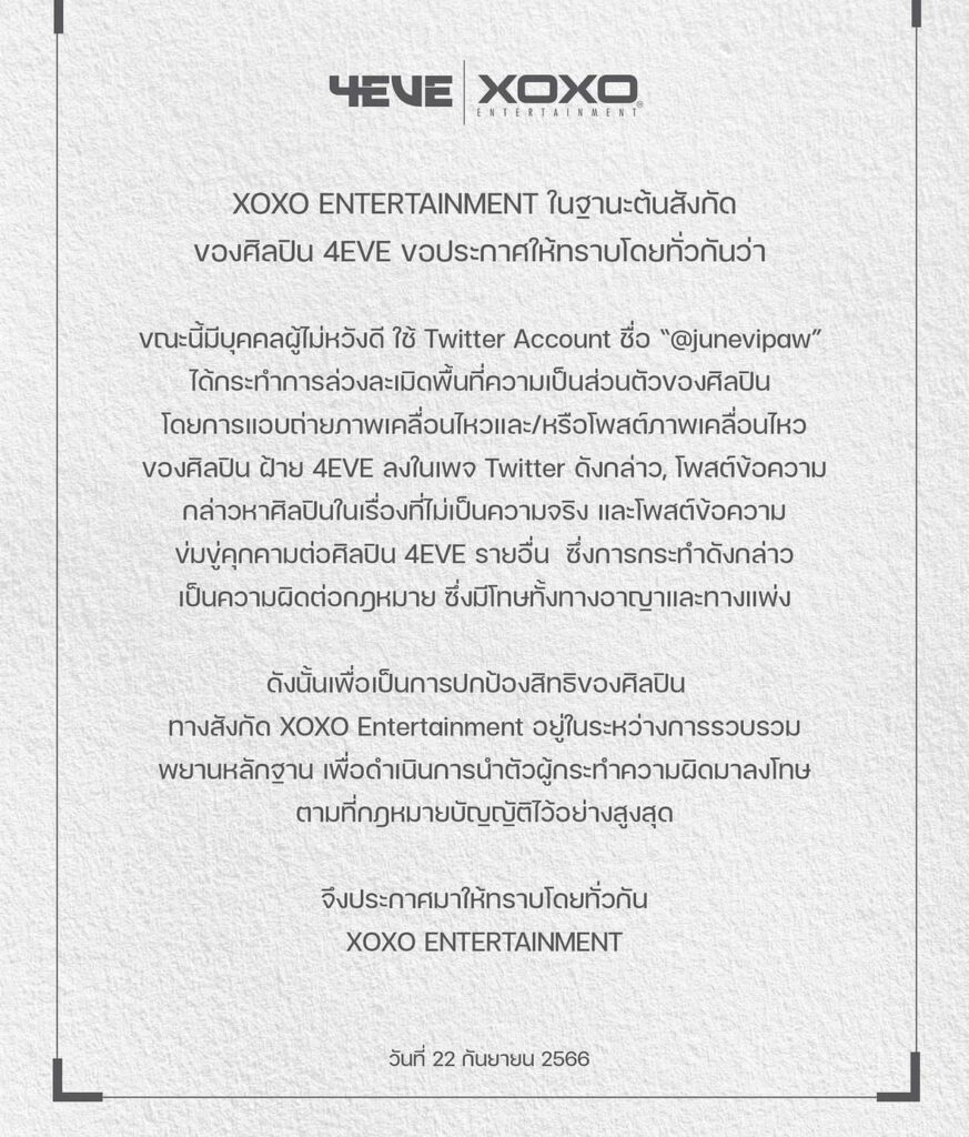 เรียกว่าช่วงนี้คนในวงการบันเทิงถูกคุกคามละเมิดสิทธ์พื้นที่ส่วนตัวจากบุคคลผู้ไม่หวังดีกันอย่างต่อเนื่อง ล่าสุดมาถึงคิวของศิลปิน 4EVE อย่าง”ฝ้าย ณัฐธยาน์”ถูกแอบถ่ายภาพเคลื่อนไหวและโพสต์ภาพเคลื่อนไหวลงในเพจTwitter ทั้งนี้ยังมีโพสต์ข้อความกล่าวหาศิลปินในเรื่องที่ไม่เป็นความจริง และข่มขู่คุกคามต่อศิลปิน 4EVE รายอื่นอีกด้วย ล่าสุดทางต้นสังกัด XOXO ENTERTAINMENT ในฐานะต้นสังกัดของศิลปิน 4EVE ไม่ได้นิ่งนอนใจ ออกมาประกาศว่า