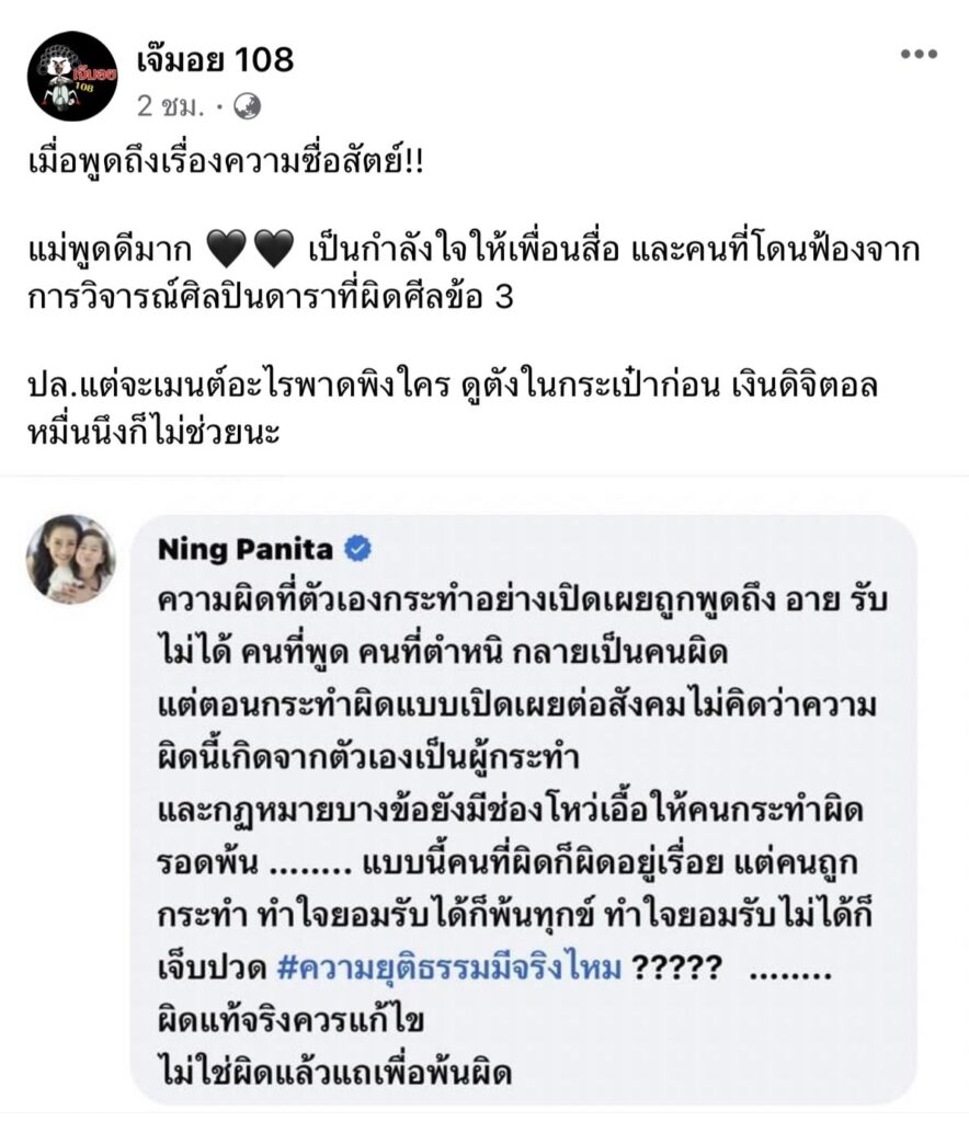 นักแสดงสาว“หนิง ปณิตา”โผล่คอมเมนต์เพจดังฟาดเดือดถึงความซื่อสัตย์ ลั่นความยุติธรรมมีจริงไหม