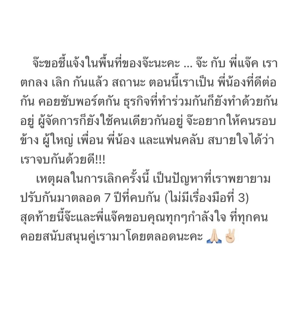 เหตุผลในการเลิกครั้งนี้ เป็นปัญหาที่เราพยายามปรับกันมาตลอด 7 ปีที่คบกัน (ไม่มีเรื่องมือที่ 3) สุดท้ายนี้จ๊ะและพี่แจ็คขอบคุณทุกๆกำลังใจ ที่ทุกคนคอยสนับสนุนคู่เรามาโดยตลอดนะคะ”
