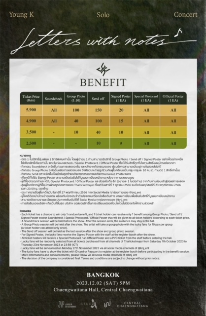 แตกตื่นกันทั้งไทม์ไลน์เมื่อ “BNJ” ผู้จัดน้องใหม่ อดีตเหล่าทีมงานจาก JYP Thailand ที่มารวมตัวกันหลังปิด JYP สาขาประเทศไทยไปเมื่อสิ้นปี 2021 ประกาศจัดคอนเสิร์ตเดี่ยวครั้งแรกของ “Young K (ยองเค)” สมาชิกวงดนตรีขวัญใจชาวไทยอย่าง “DAY6 (เดย์ซิกซ์)” กับงาน “Young K Solo Concert <Letters with notes> in Bangkok” ซึ่งปักหมุดจัดขึ้นในวันเสาร์ที่ 2 ธันวาคม 2023 เวลา 17.00 น. ณ แจ้งวัฒนะ ฮอลล์ เซ็นทรัลแจ้งวัฒนะ