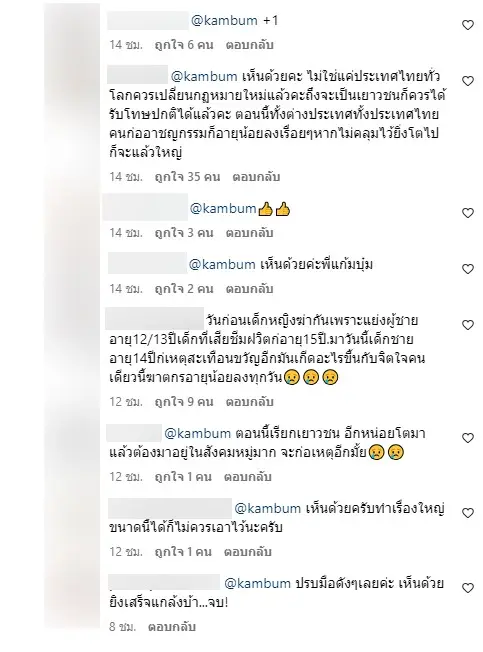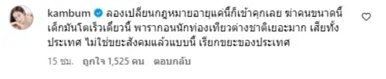 โดย แก้มบุ๋ม ได้คอมเมนต์ใต้โพสต์ที่มีการนำเสนอข่าวดังกล่าว ระบุว่า “ลองเปลี่ยนกฎหมาย อายุแค่นี้ก็เข้าคุกเลย ฆ่าคนขนาดนี้ เด็กมันโตเร็วเดี๋ยวนี้ พารากอนนักท่องเทียวต่างชาติเยอะมาก เสียทั้งประเทศ ไม่ใช่ขยะสังคมแล้วแบบนี้ เรียกขยะของประเทศ”ท่ามกลางชาวเน็ตต่างเข้ามาคอมเมนต์เห็นด้วยอย่างมากมาย