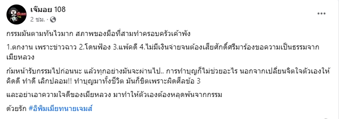 วงการบันเทิงมีประเด็นร้อนมาให้ขาเม้าท์ต้องทำการบ้านกันอีกแล้ว หลังเพจดังอย่าง เจ๊มอย 108 ได้ออกมาซัดแรงถึงมือที่สาม ที่ทำให้ชีวิตครอบครัวคนอื่นพัง ตอนนี้เหมือนกรรมติดจรวด เพราะต้องตกงานเซ่นพิษข่าวฉาว โดยระบุข้อความว่า