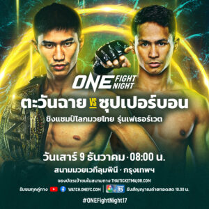 ติดตามศึกหยุดโลกระหว่าง “ตะวันฉาย vs ซุปเปอร์บอน” ได้ในศึก ONE Fight Night 17 ณ สนามมวยเวทีลุมพินี โดยจะมีการถ่ายทอดสดในช่วงไพรม์ไทม์อเมริกา ซึ่งตรงกับช่วงเช้าของวันเสาร์ที่ 9 ธ.ค.นี้ เริ่มคู่แรกเวลา 07.00 น.