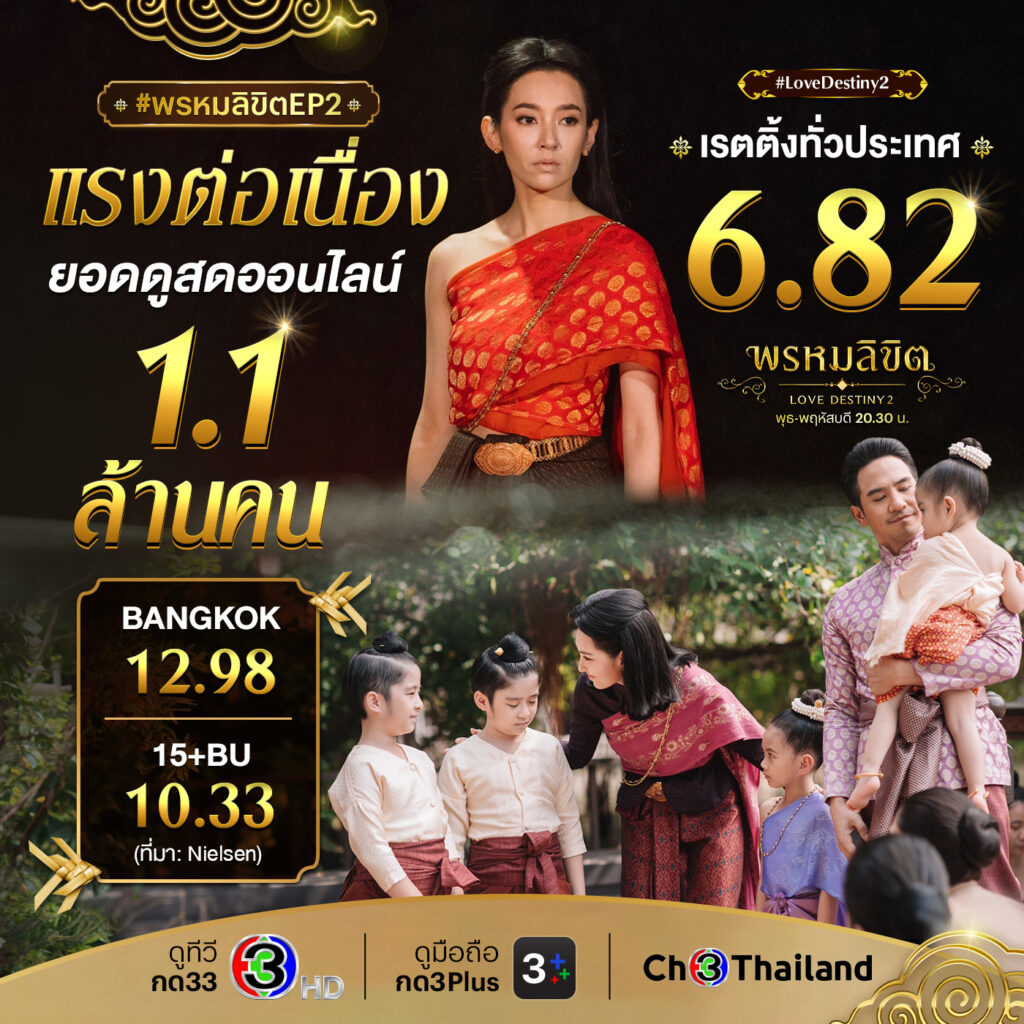แรงฉุดไม่อยู่แล้วตอนนี้ สำหรับละครทางช่อง 3 เรื่อง “พรหมลิขิต” จากค่าย บรอดคาซท์ ไทย เทเลวิชั่น ที่เต็มอิ่มไปด้วยความสนุกจนคนดูกล่าวขวัญกันไปทั่วพระนคร กับผลงานการแสดงของคู่พระนาง “โป๊ป ธนวรรธน์” กับสาว “เบลล่า ราณี” หลังออกอากาศไปได้เพียงแค่ 2 ตอน ก็สามารถกวาดเรตติ้งไปได้อย่างถล่มทลายด้วยเรตติ้งทั่วประเทศ 6.82 ในกลุ่มผู้ชมกรุงเทพฯ ทุบหนักไปถึง 12.98 และกลุ่มผู้ชมอายุ 15 ปี ขึ้นไป หรือ กลุ่ม 15 BU+ (Bangkok and Urban) ดีดไปถึง 10.33 ถือว่าสถิติเรตติ้งที่สูงสุดในปี 2566 กันเลยทีเดียว