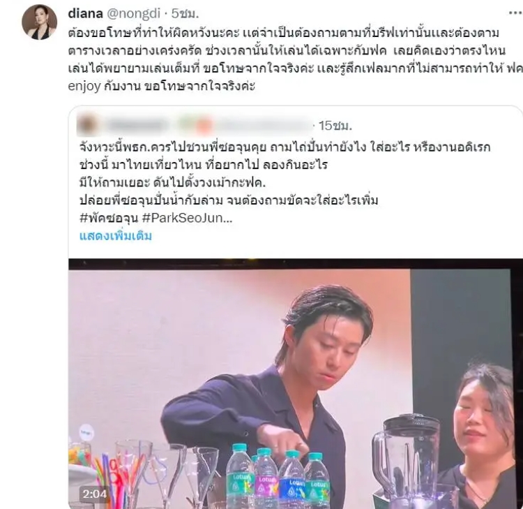 แต่หลังจบงานกลับมีดราม่า เมื่อมีผู้ใช้ทวิตเตอร์ (X) รายหนึ่ง ออกมาโพสต์คลิปช่วงที่ พัคซอจุน กำลังทำกิจกรรมบนเวที วิจารณ์การทำหน้าที่พิธีกรของ ได๋ ไดอาน่า ไม่สนใจพูดคุยกับศิลปินดัง แต่ตั้งวงเม้าท์กับแฟนคลับแทน โดยระบุข้อความว่า “จังหวะนี้พธก.ควรไปชวนพี่ซอจุนคุย ถามไถ่ปั่นทำยังไง ใส่อะไร หรืองานอดิเรก ช่วงนี้ มาไทยเที่ยวไหน ที่อยากไป ลองกินอะไร มีให้ถามเยอะ ดันไปตั้งวงเม้ากะฟค. ปล่อยพี่ซอจุนปั่นน้ำกับล่าม จนต้องถามขัดจะใส่อะไรเพิ่ม #พัคซอจุน #ParkSeoJun #โลตัสฟินไม่พักกับพัคซอจุน”