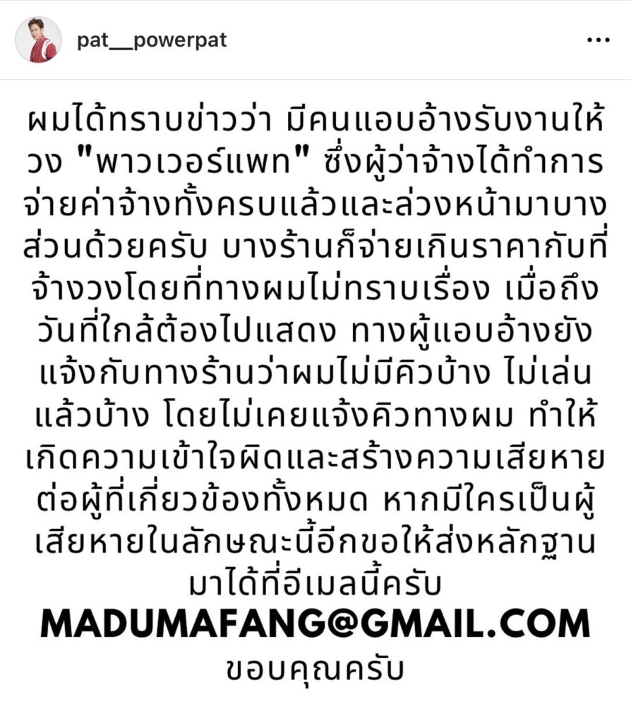 “ผมได้ทราบข่าวว่า มีคนแอบอ้างรับงานให้วง” พาวเวอร์แพท” ซึ่งผู้ว่าจ้างได้ทำการจ่ายค่าจ้างทั้งครบแล้ว และล่วงหน้ามาบางส่วนด้วยครับ บางร้านก็จ่ายเกินราคาที่จ้างวงโดยที่ทางผมไม่ทราบเรื่อง เมื่อถึงวันที่ใกล้ต้องไปแสดงทางผู้แอบอ้างยังแจ้งกับทางร้านว่าผมไม่มีคิวบ้าง ไม่เล่นแล้วบ้าง โดยไม่มีการแจ้งคิวทางผม ทำให้เกิดความเข้าใจผิดและสร้างความเสียหายต่อผู้ที่เกี่ยวข้องทั้งหมด หากมีใครเป็นผู้เสียหายในลักษณะนี้อีก ขอให้ส่งหลักฐานมาได้ที่อีเมลนี้ครับ