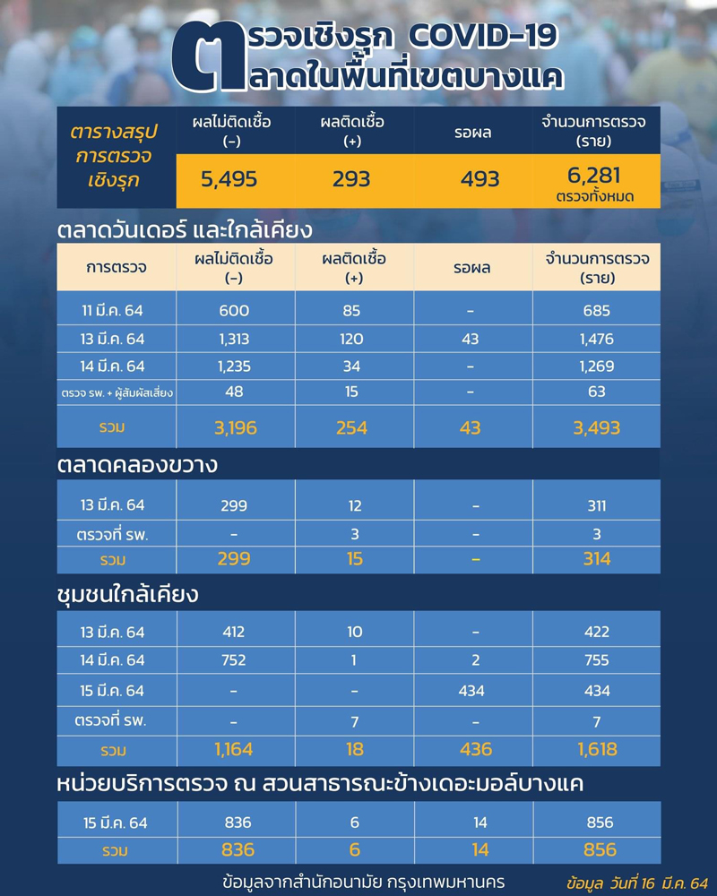 กทม.รายงานพบผู้ติดเชื้อโควิด-19 เคสตลาดบางแค เพิ่ม 69 คน ส่งผลยอดรวมอยู่ที่ 293 คน รอผลอีก 493 คน จากการตรวจ 6,281 คน