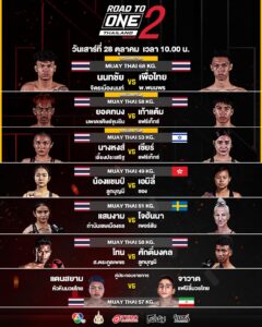 ศึก Road To ONE Thailand ซีซัน 2 เวทีสานฝันนักมวยไทยดาวรุ่งสู่เวทีระดับโลก ภายใต้ความร่วมมือของ วัน แชมเปียนชิพ (ONE), เทโร เอ็นเทอร์เทนเมนท์, ช่อง 7 HD และแฟร์เท็กซ์ไฟต์ โปรโมชัน เดินทางมาถึงในรอบชิงชนะเลิศเป็นที่เรียบร้อย โดยจะระเบิดความมันในวันเสาร์ที่ 28 ต.ค.นี้ ณ สนามมวยเวทีลุมพินี (รามอินทรา)