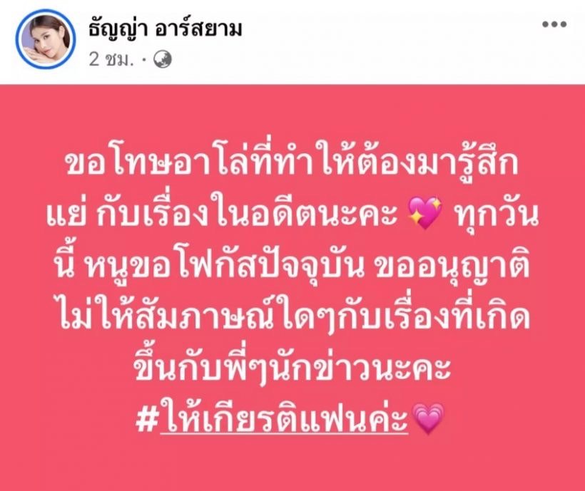 “ธัญญ่า อาร์สยาม”ฟาดปมนักร้อง อ. โลก4ใบ ขอโฟกัสปัจจุบัน ยันให้เกียรติแฟน