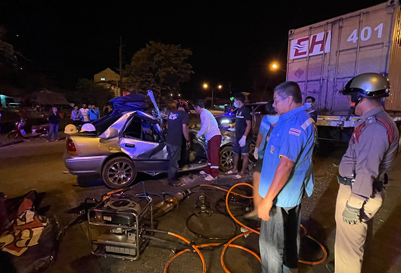 รถเก๋งพุ่งชนท้ายรถบรรทุกสิบล้อกลางสี่แยกคูหา จ.สงขลา แรงงานต่างด้าวเสียชีวิตคาที่ 2 เจ็บ 1 คาดคนขับหลับใน