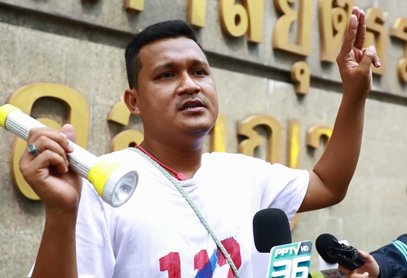 “ไบร์ท ชินวัตร”ทำกิจกรรมส่องไฟฉายหน้าศาลอาญา