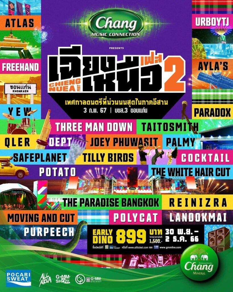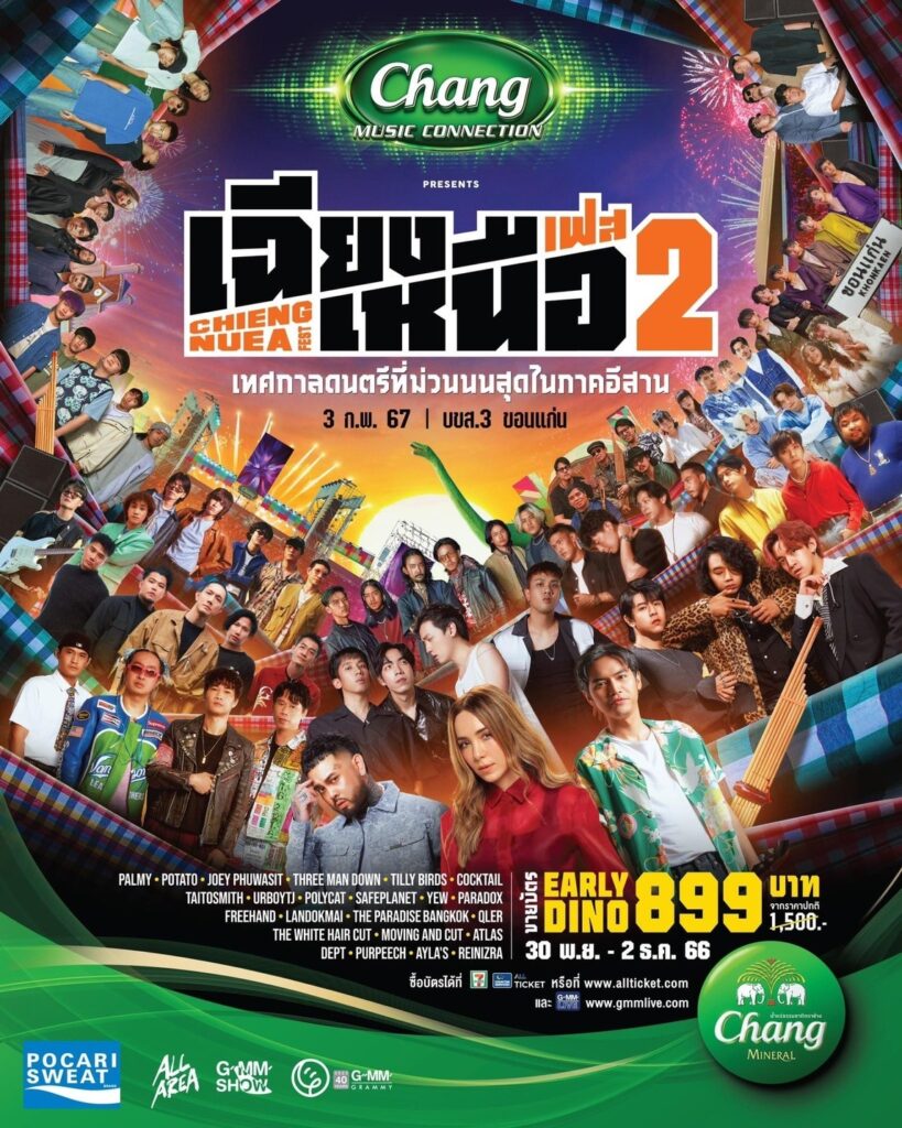 จัดเต็มขนาดนี้เตรียมตัวไปเฮกับเพื่อนใหม่ ม่วนจอยกับเพื่อนเก่า กับเทศกาลดนตรีที่ใหญ่ที่สุด และม่วนที่สุดในภาคอีสาน Chang Music Connection presents “เฉียงเหนือเฟส 2” ที่จะจัดขึ้นในวันเสาร์ที่ 3 กุมภาพันธ์ 2567 ณ บขส 3 จังหวัด ขอนแก่น ห้ามพลาด!!บัตร Early Dino ราคา 899 บาท (จากราคาปกติ 1,500 บาท) เปิดจำหน่ายบัตร ตั้งแต่วันที่ 30 พฤศจิกายน 2566 ถึงวันที่ 2 ธันวาคม 2566 ที่ www.gmmlive.com หรือ www.allticket.com และเคาน์เตอร์เซอร์วิส All Ticket ในร้าน 7-Eleven ทุกสาขาทั่วประเทศ และสามารถติดตามรายละเอียดเพิ่มเติมได้ที่ FB / IG / TWITTER / TIKTOK : ChiengNueaFest