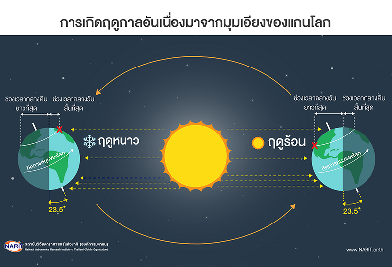 ระนาบโคจรของโลกรอบดวงอาทิตย์ ทำให้พื้นที่ต่าง ๆ ทั่วโลกได้รับแสงอาทิตย์ในปริมาณไม่เท่ากัน ส่งผลให้มีอุณหภูมิต่างกัน รวมถึงระยะเวลากลางวันและกลางคืนก็ต่างกันด้วยเหตุนี้ทำให้เกิดฤดูกาลขึ้นบนโลกนั้นเอง จะสังเกตได้ว่าในฤดูร้อนเวลากลางวันจะยาวกว่ากลางคืน ดวงอาทิตย์จะขึ้นเร็วและตกช้า แตกต่างกับฤดูหนาวเวลากลางคืนจะยาวนานกว่ากลางวัน ดวงอาทิตย์จะขึ้นช้าและตกเร็ว