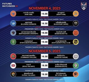 สำหรับโปรแกรมฟุตซอลไทยลีก2023 เลกที่สอง นัดที่ 20 ในวันเสาร์ที่ 4 พ.ย.66 และวันอาทิตย์ที่ 5 พ.ย.66 มีการแข่งขันทั้งหมด 7 คู่ โดยวันเสาร์ที่ 4 พ.ย.66 เวลา 15.00 น. การท่าเรือ เอเอสเอ็ม พบ สุราษฎร์ธานี ที่โกดัง สเตเดียม ท่าเรือ ถ่ายทอดสด Facebook และ Youtube Futsalthailand และ แอพพลิเคชั่น T Sports 7, เวลา 16.30 น. บลูเวฟ ชลบุรี พบ แบล็คเพิร์ล ยูไนเต็ด ที่บลูเวฟ อารีน่า(เทศบาลเมืองชลบุรี) จ.ชลบุรี ถ่ายทอดสดทาง Facebook และ Youtube Futsalthailand, ช่องฟรีทีวี T Sports 7 และแอพพลิเคชั่น, เวลา 18.00 น. มอภาคตะวันออกเฉียงเหนือ พบ เกษมบัณฑิต เอฟซี ที่ยิมเนเซี่ยม ม.ภาคตะวันออกเฉียงเหนือ ถ่ายทอดสด Facebook และ Youtube Futsalthailand และ แอพพลิเคชั่น T Sports 7 และ เวลา 19.30 น. ราชภัฏเพชรบุรี พบ นนทบุรี ฟุตซอลคลับ ที่ยิมเนเซี่ยม 1 มรภ.เพชรบุรี จ.เพชรบุรี ถ่ายทอดสด Facebook และ Youtube Futsalthailand และ แอพพลิเคชั่น T Sports 7