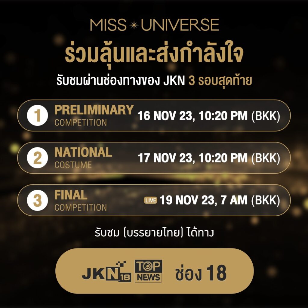 สามารถรับชมการประกวด Miss Universe ครั้งที่ 72 ทางช่อง JKN18 Top News (ตามเวลาประเทศไทย) โดยแบ่งออกเป็น 3 รอบ ได้แก่