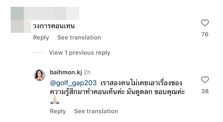 แต่อย่างไรก็ตาม ก็มีชาวเน็ตบางคนได้เข้ามาคอมเมนต์แสดงความคิดเห็นเชิงแซะทั้งคู่ว่า “วงการคอนเทนต์” งานนี้ทางสาวใบหม่อนได้เห็นข้อความ ก็ได้เข้ามาฟาดกลับว่า “เราสองคนไม่เคยเอาเรื่องของความรู้สึกมาทำคอนเทนต์ค่ะ มันดูตลก ขอบคุณค่ะ” ล่าสุดเจ้าตัวก็ได้ปิดคอมเมนต์โพสต์ดังกล่าวไปเป็นที่เรียบร้อยแล้ว
