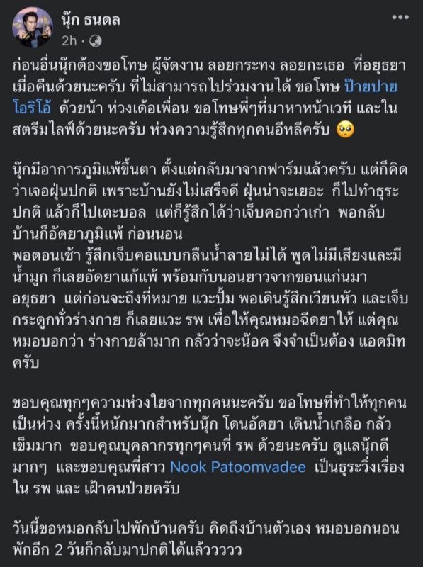 “พอตอนเช้า รู้สึกเจ็บคอแบบกลืนน้ำลายไม่ได้ พูดไม่มีเสียงและมีน้ำมูก ก็เลยอัดยาแก้แพ้ พร้อมกับนอนยาวจากขอนแก่นมาอยุธยา แต่ก่อนจะถึงที่หมายแวะปั้มพอเดินรู้สึกเวียนหัวและเจ็บกระดูกทั่วร่างกาย ก็เลยแวะ รพ เพื่อให้คุณหมอฉีดยาให้ แต่คุณหมอบอกว่า ร่างกายล้ามาก กลัวว่าจะน๊อค จึงจำเป็นต้องแอดมิทครับ ขอบคุณทุกๆ ความห่วงใยจากทุกคนนะครับ ขอโทษที่ทำให้ทุกคนเป็นห่วง ครั้งนี้หนักมากสำหรับนุ๊ก โดนอัดยา เดินน้ำเกลือ กลัวเข็มมาก”