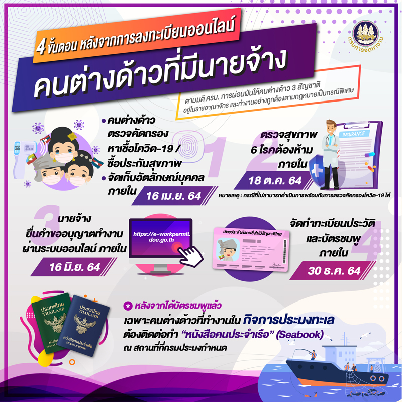 ด้านนายสุชาติ พรชัยวิเศษกุล อธิบดีกรมการจัดหางาน กล่าวว่า ในส่วนการตรวจโรคต้องห้ามหากมีเหตุให้ดำเนินการไม่ทัน ภายในวันที่ 16 เมษายน 2564 ให้ไปดำเนินการให้แล้วเสร็จ ไม่เกินวันที่ 18 ตุลาคม 2564