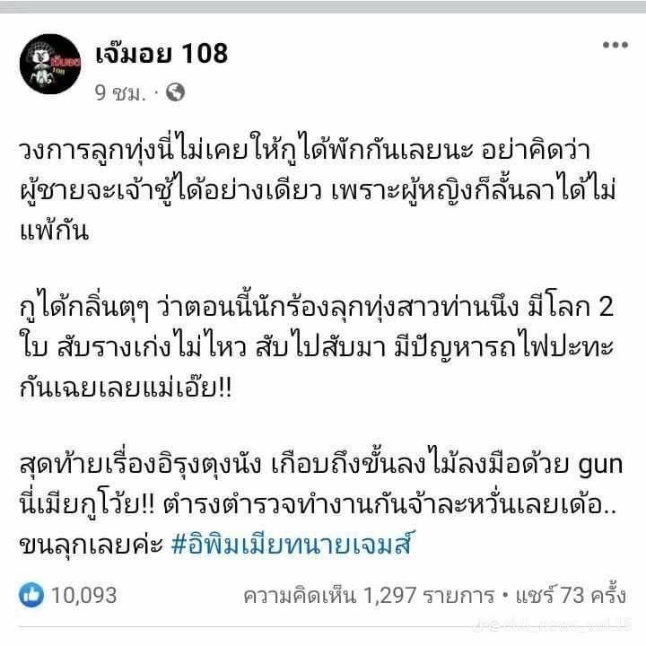 เรียกว่าก่อนหน้านี้ทำเอาวงการลูกทุ่งสั่นสะเทือน เมื่อเพจดังออกมาโพสต์ข้อความว่า “วงการลูกทุ่งนี่ไม่เคยให้กูได้พักกันเลยนะ อย่าคิดว่าผู้ชายจะเจ้าชู้ได้อย่างเดียว เพราะผู้หญิงก็ลั้นลาได้ไม่แพ้กัน กูได้กลิ่นตุ ๆ ว่าตอนนี้นักร้องลุกทุ่งสาวท่านนึง มีโลก 2 ใบ สับรางเก่งไม่ไหว สับไปสับมา มีปัญหารถไฟปะทะกันเฉยเลยแม่เอ๊ย!! สุดท้ายเรื่องอิรุงตุงนัง เกือบถึงขั้นลงไม้ลงมือด้วย gun นี่เมียกูโว้ย!! ตำรงตำรวจทำงานกันจ้าละหวั่นเลยเด้อ.. ขนลุกเลยค่ะ”