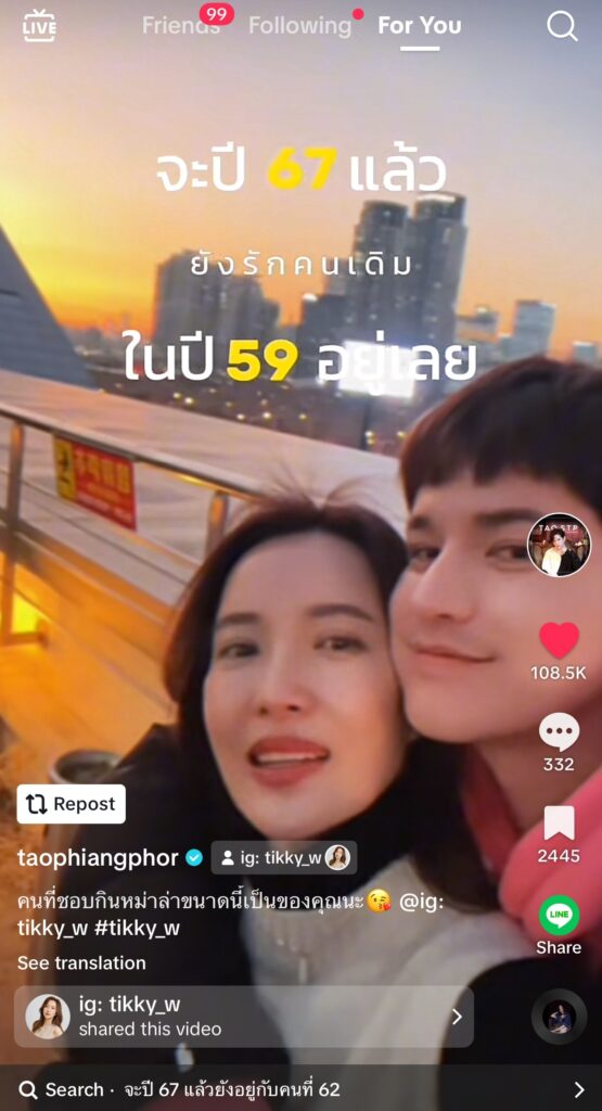 สมแล้วที่เป็นพระเอกอารมณ์ดี สายหล่อตลก แถมพ่วงตำแหน่งยูทูบเบอร์ และ TikToker “เต๋า เศรษฐพงศ์ เพียงพอ” ที่ขยันทำคอนเทนต์ใหม่ สด สนุก ลงช่องยูทูบ @TAO_STP ตลอดเวลา ล่าสุด ก็ทำคนโสดมีหนาว เพราะ เต๋า โชว์ความรักหวานเวอร์ กอดแฟนสาว “ติ๊กกี้ วิลาสิณี ธัญญะวิเศษศิลป์” ท่ามกลางบรรยากาศสวยงาม ลง TikTok แอคเคาน์ @tao_stp พร้อมกับใส่แคปชั่น “คนที่ชอบกินหม่าล่าขนาดนี้เป็นของคุณนะ” แล้วยังหยอดคำหวาน “จะปี 67 แล้ว ยังรักคนเดิมในปี 59 อยู่เลย” จนแฟนคลับต่างเข้ามาคอมเมนต์และแชร์คอนเทนต์นี้สนั่นโซเชียล https://vt.tiktok.com/ZSNmuHmgV/