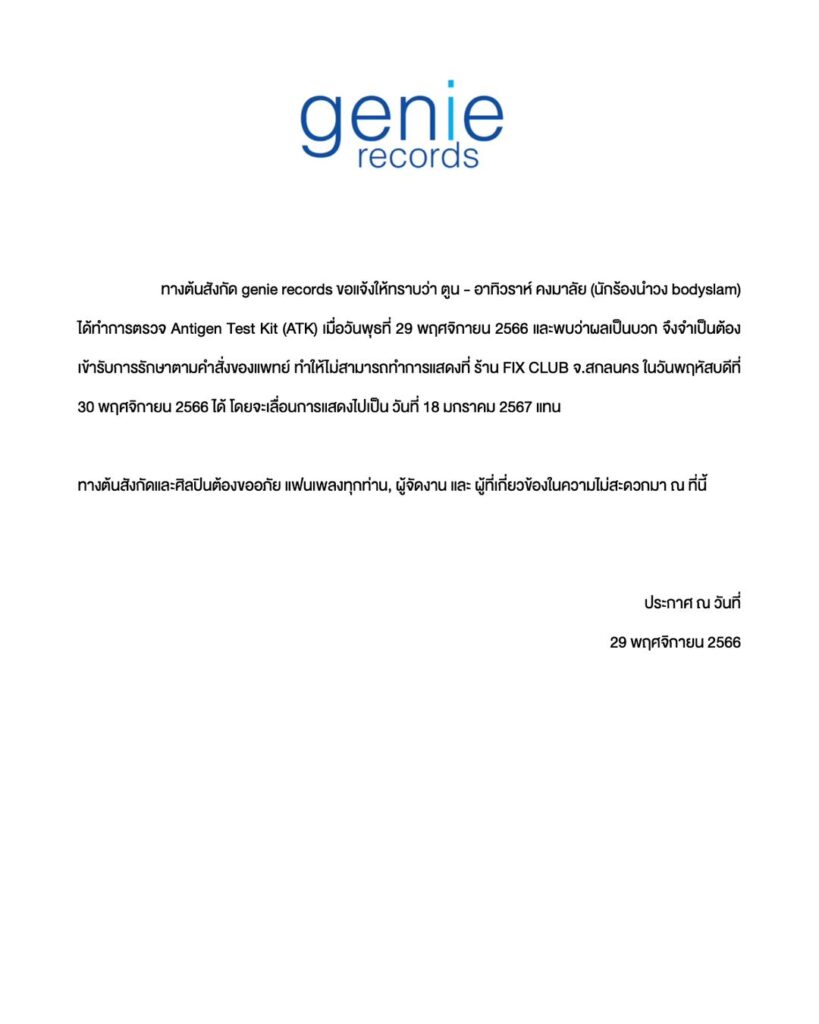 “ทางต้นสังกัด genie records ขอแจ้งให้ทราบว่า ตูน-อาทิวราห์ คงมาลัย (นักร้องนำวง bodyslam) ได้ทำการตรวจ Antigen Test Kit (ATK) เมื่อวันพุธที่ 29 พฤศจิกายน 2566 และพบว่าผลเป็นบวก จึงจำเป็นต้องเข้ารับการรักษาตามคำสั่งของแพทย์