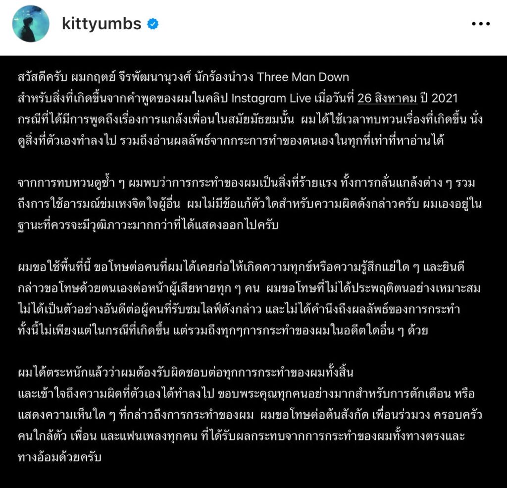 ล่าสุดทางด้าน”กิต” ได้ออกมาเคลื่อนไหว เคลียร์ดราม่าดังกล่าว โดยโพสต์ภาพที่เขียนข้อความว่า “สวัสดีครับ ผมกฤตย์ จีรพัฒนานุวงศ์ นักร้องนําวง Three Man Down สําหรับสิ่งที่เกิดขึ้นจากคําพูดของผมในคลิป Instagram Live เมื่อวันที่ 26 สิงหาคม ปี 2021 กรณีที่ได้มีการพูดถึงเรื่องการแกล้งเพื่อนในสมัยมัธยมนั้น ผมได้ใช้เวลาทบทวนเรื่องที่เกิดขึ้น นั่ง ดูสิ่งที่ตัวเองทําลงไป รวมถึงอ่านผลลัพธ์จากกระการทําของตนเองในทุกที่เท่าที่หาอ่านได้